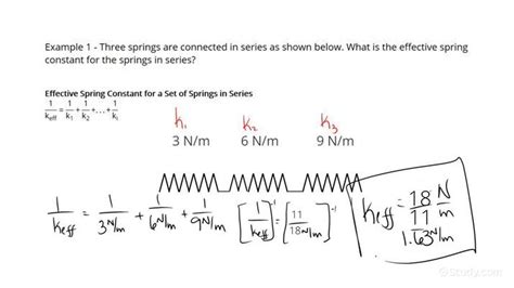 Web the spring constant, k, appears in hooke's law and describes the stiffness of the spring, or in other words, how much force is needed to extend it by a given distance. The spring constant in this case must therefore be half that of an individual spring, k effective = k. Web in the series configuration, we can see that the combined spring is equivalent to one spring with double the length. But there are some weird problems where finding the. Web i know that for springs in parallel, the effective spring constant is $k_1+k_2$ and for springs in series the constant is $1/(1/k_1+1/k_2)$. Calculate the effective spring constant for all spings in series using the equation: Identify the spring constant for each individual spring in series k 1, k 2,., k i. Web equivalent spring constant (series) when putting two springs in their equilibrium positions in series attached at the end to a block and then displacing it from that equilibrium, each of the springs will. 1 k e f f = 1 k 1.